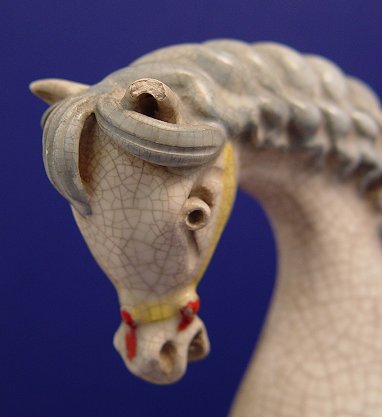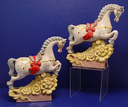 REARING HORSE MOTIF CHINESE STYLE ROOF TILES: Pair of polychrome glazed earthenware roof tiles in the shape of rearing horses on scrolling yellow waves, generalized crazing, one with chip to ear, both signed W//S, 10''h. x 8 1/2''l.