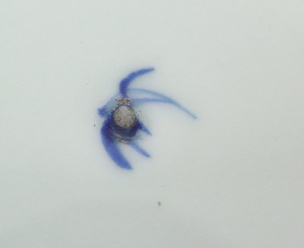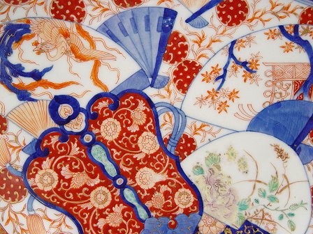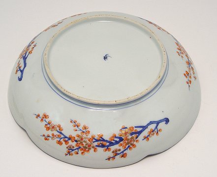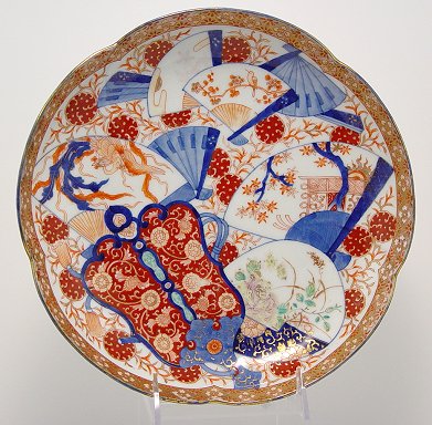 SIGNED JAPANESE IMARI DEEP PLATE: Scallop rim bowl or deep plate. Hand painted iron red and cobalt fan decorations. 10 1/4'' dia.