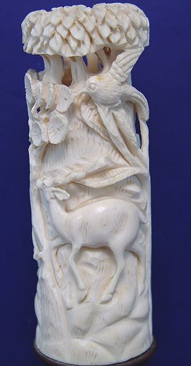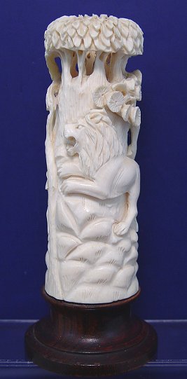 CARVED IVORY TUSK: Lion on one side, antelope and bird carved into the other, all under what appears to be a tree. Ivory is 5 3/4''h, wooden base adds 1 3/4''.