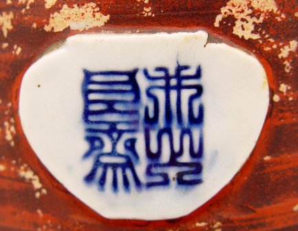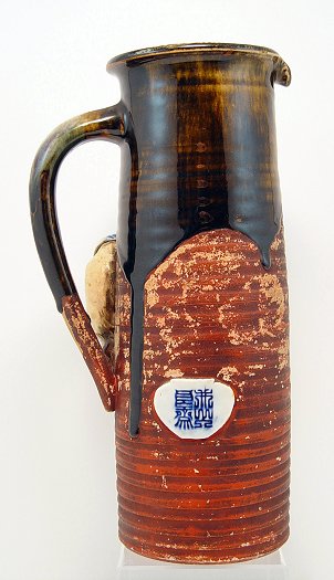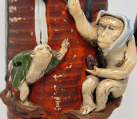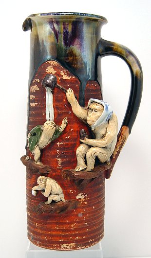 SUMIDA GAWA JAPANESE EARTHENWARE PITCHER: Large scale pitcher with applied monkey decoration. Drip glaze at the top and down the handle. Vase shaped medallion with character marks. Please note loss of one little monkey leg. 12 1/2''h.