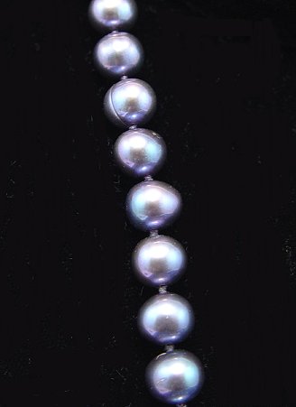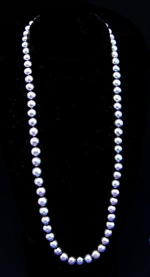 24'' CULTURED BLACK PEARL NECKLACE: Strand of approx. 8.5-9mm black pearls with rainbow glow and occasional circle', 14kt clasp, double knotted.