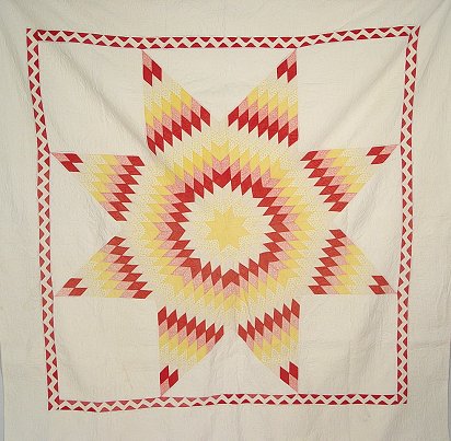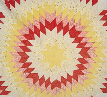 HAND SEWN LONESTAR QUILT: Pink, yellow and muted red. Nicely quilted pattern. Approx. 72'' x 72''.
