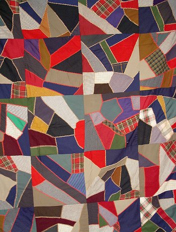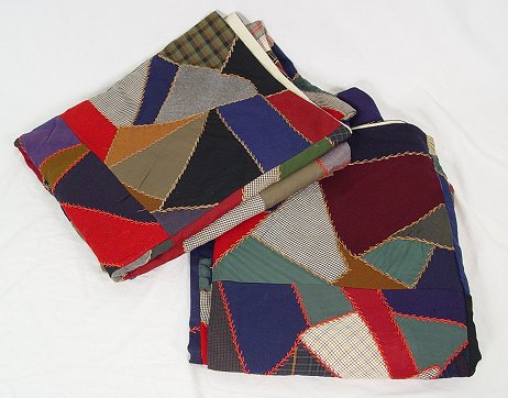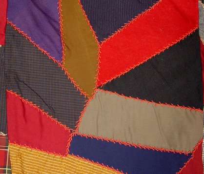 PAIR OF JEWEL TONE HAND SEWN CRAZY QUILTS: Matched pair, in deep jewel tone colors. Khaki back. Approx. 85'' x 66''.