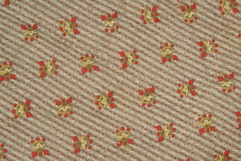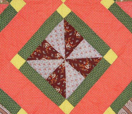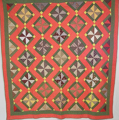 GRAPHICALLY PLEASING HAND SEWN QUILT: Red, yellow and dark green repeating pin wheel design. Please note there is a quarter size spot of discoloration and wear. Approx. 85'' x 78''.