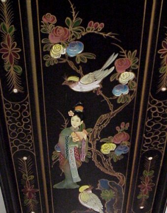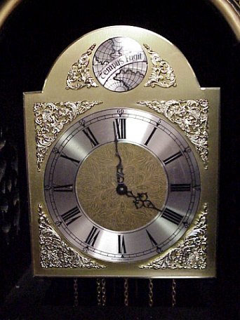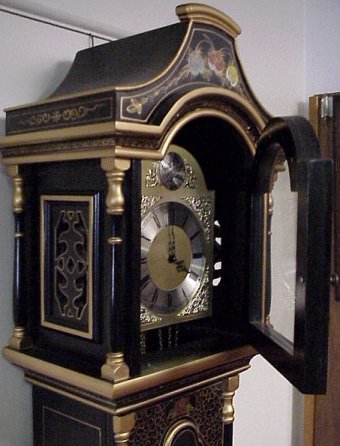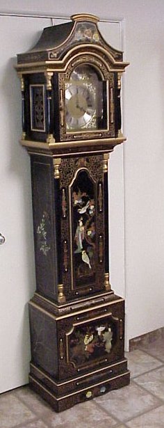 CHINOISERIE DECORATED GERMAN MADE GRANDFATHER'S CLOCK: Applied figural and painted decoration heavy on the gold. Black lacquer ground. Weight driven clock. 78''h. 18''w.