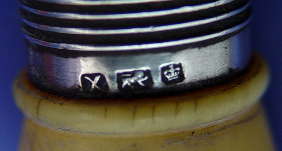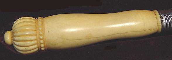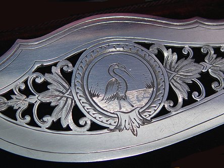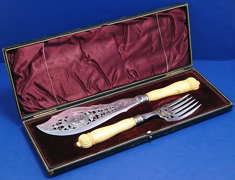 19th C IVORY HANDLE FISH SET: The carved ivory handles end in a crown. The blade and tines have pierced and engraved decoration. Bolsters bear Sheffield hallmarks and makers initials TC JWC. In original presentation box. Knife is 13''l, the serving fork is 9 1/2''l.