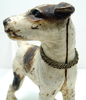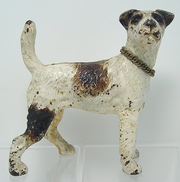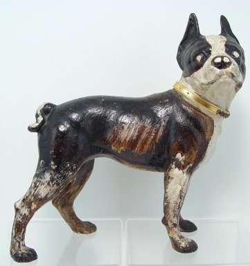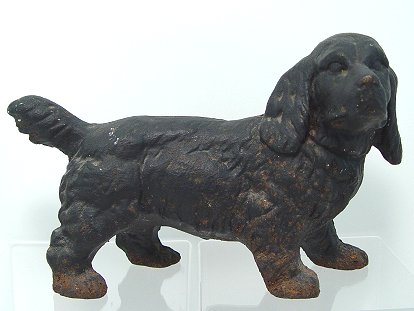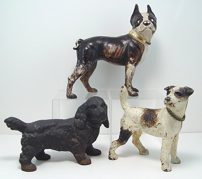 3 VINTAGE CAST IRON DOG DOORSTOPS: Terrier with original paint, 8'' x 8''. Black spaniel (some rust), 7'' x 11''. And Boston Terrier with touched up paint. 10 1/2'' x 10''.