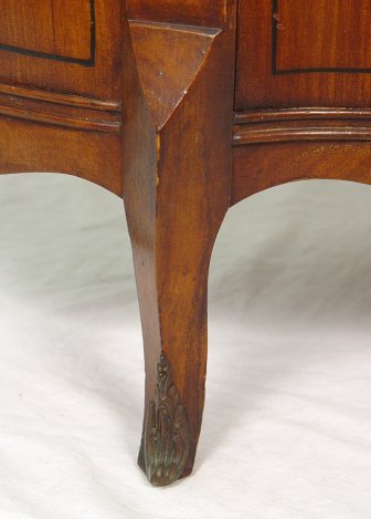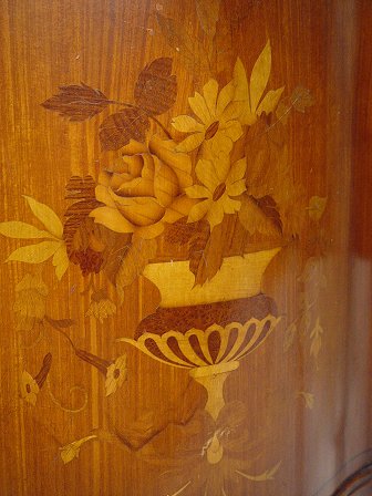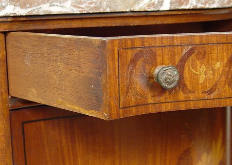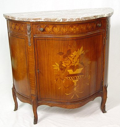 FRENCH MARQUETRY MARBLE TOP BOMBAY COMMODE: Earlier 20th C. Fine floral inlay on the door and the single drawer. ormolu mounts, shaped marble top. 32''h. x 34'' x 16''.