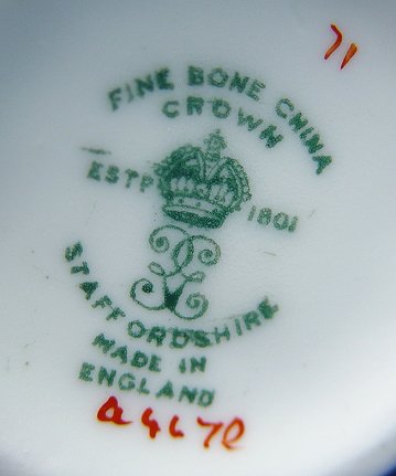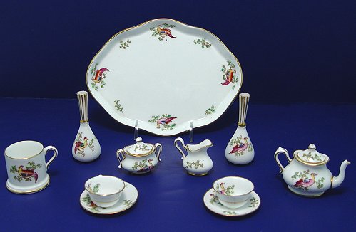 9 PIECE CROWN STAFFORDSHIRE MINIATURES: Teapot, creamer, sugar, 2 cups and saucers, 2 vases, mug, and a 7 1/2'' tray to place it all on. The teapot is 2''h. vases are 3''h.