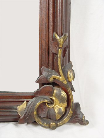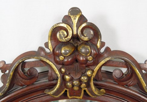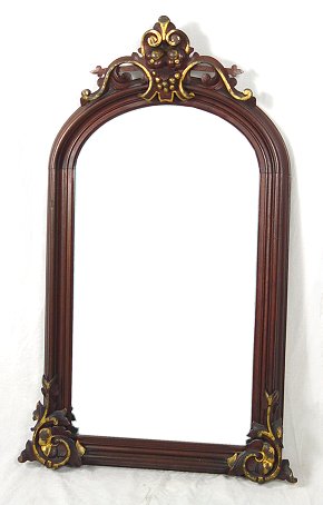 MOST ATTRACTIVE VICTORIAN ARCHED PARLOR MIRROR: Fruit motif carved crest, Victorian race track style molding to frame, stylized floral supports and enhancements to base, 33''h. x 23''w.
