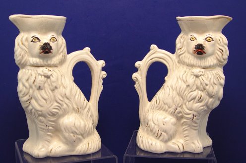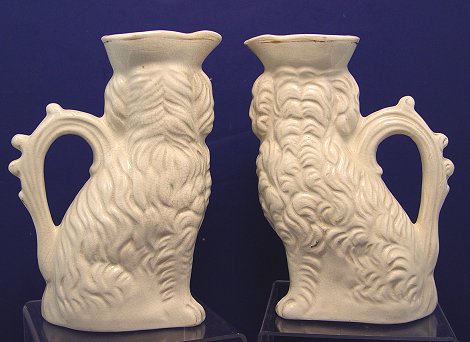 PAIR OF STAFFORDSHIRE DOG PITCHERS: Unusual form, expected crazing. 8''h.