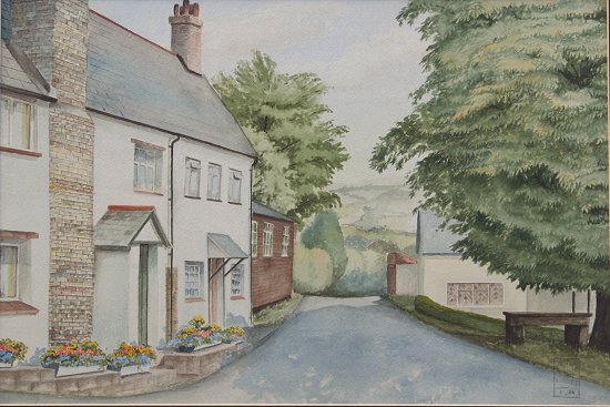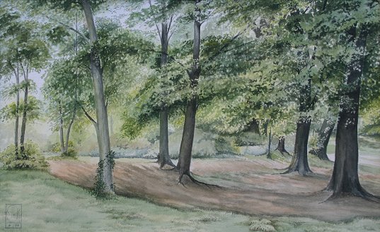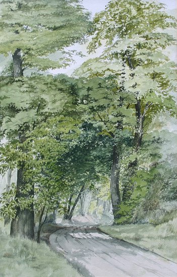 LOT OF THREE 19TH C ENGLISH? W/C PAINTINGS: One is signed on back P.T. Andrews?, all are monogrammed in the lower corners and all of the pieces are encased in custom hand-painted matting, forest trail sight size is 17 1/4'' x 11'', monogrammed lower left and dated 8 '86, forest clearing sight size 10'' x 16'', monogrammed lower left and dated 6 '86, and village street scene is 10 3/4'' x 16'', monogrammed lower right and dated 2 '86.