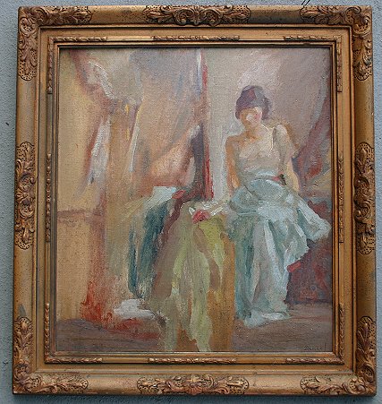 IMPRESSIONIST INTERIOR SCENE WITH WOMAN, O/CB, 15 1/2'' x 14'', signed lower right ''Dancel'', encased in period carved worn molding, 19 1/4'' x 18'', faint N.Y. gallery label affixed verso. Condition - Needs cleaning.