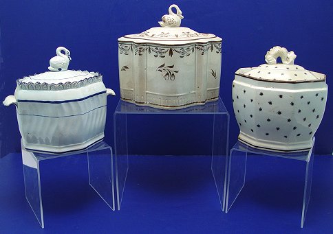 3 19TH C STAFFORDSHIRE SUGARS WITH SWAN FINIALS: Covered sugars with swan and dolphin fish finials. One is believed to be Castleford. Please call for condition.