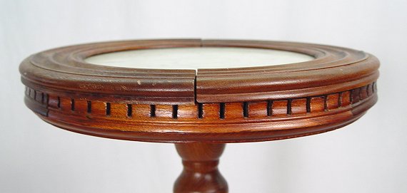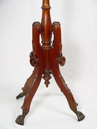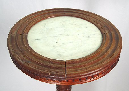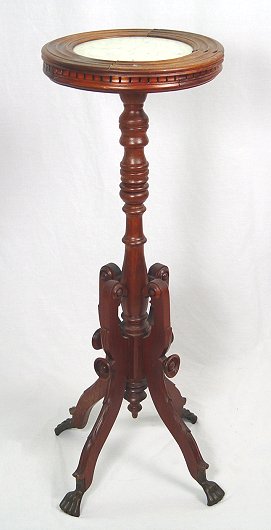 WALNUT VICTORIAN MARBLE TOP PARROT LEG TABLE: Round white marble framed with dentil molding. Single pedestal ''supported'' by three carved parrots. Three curved legs ending in brass paw feet. 37''h, 13 3/4'' dia.