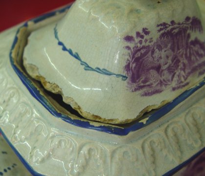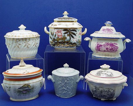 SIX 19TH C STAFFORDSHIRE COVERED SUGARS: A good representation of English earthenware shapes and colors. Flow blue with luster trim, black transfer with luster, molded stoneware. Please call for condition.