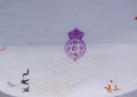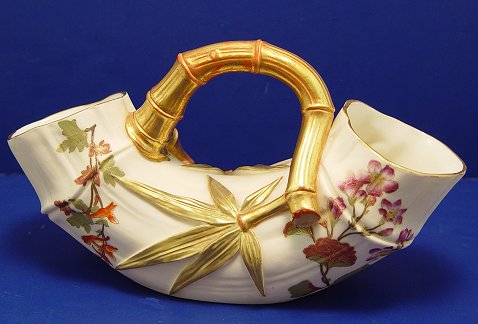 ROYAL WORCESTER DOUBLE ENDED VASE WITH BAMBOO HANDLE: Fine hand painted English porcelain. 10 1/2''l, 5 1/2''h. No chips or cracks.