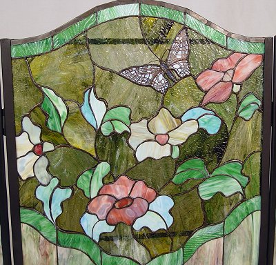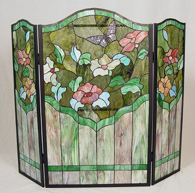 THREE PANEL STAINED GLASS FIRE SCREEN: Bright colors, floral with butterflies. Contemporary. 34''h, x 40 1/2''w.