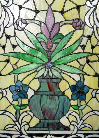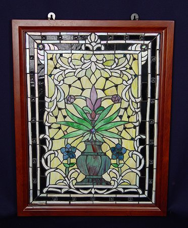 WOOD FRAMED STAINED GLASS PANEL: Flower filled vase motif. Wooden frame hangs from chains. Contemporary. 26'' x 20''.