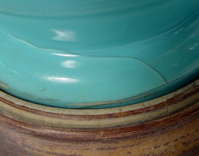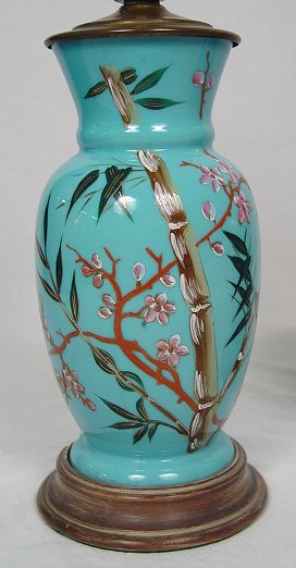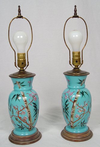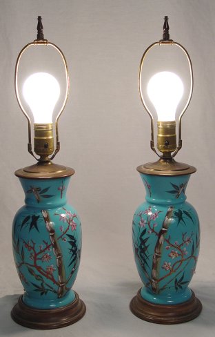 PAIR OF BLUE BRISTOL GLASS LAMPS: Hand painted in an oriental bamboo motif, 20''h. overall.
