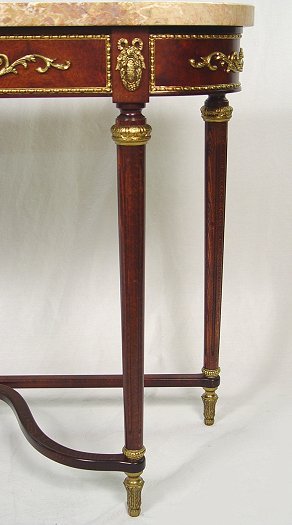 FRENCH MARBLE TOP FOYER TABLE: Marble top demi table, ormolu mountings. Later 20th C. 30 1/2''h. x 43'' c 14''.