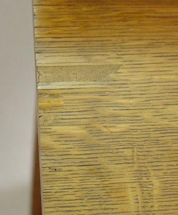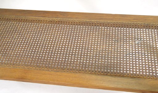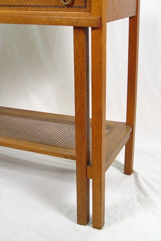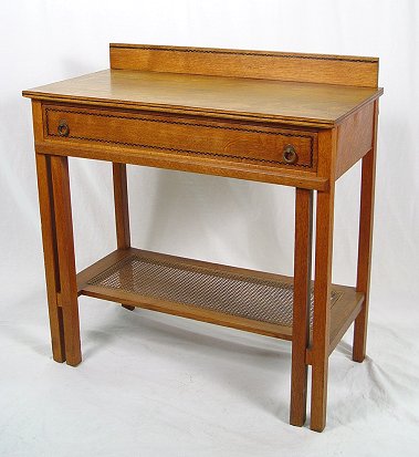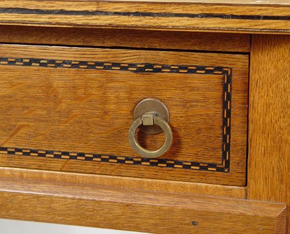 ARTS AND CRAFTS OAK SIDEBOARD: Ca. 1920's. Northern Furniture Co. Checked parquetry inlay on the full length drawer and backsplash, ring pulls. 39 1/2''h, overall, x 38'' x 38''. Please note small tear in the caned stretcher shelf and slight loosening of veneer along edge.