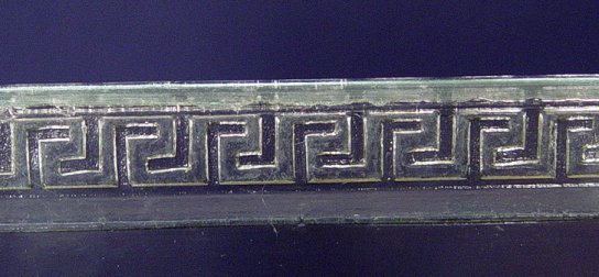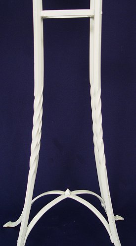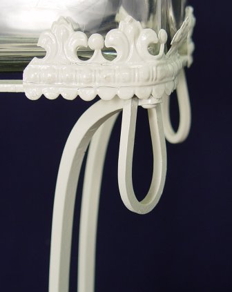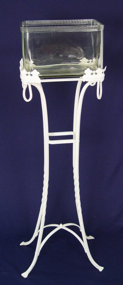 ART DECO ERA IRON FISH BOWL STAND: Stand is 34''h. plus corner decorations 35 1/2''h., surface area to hold rectangular bowl is 12'' x 9'', Glass bowl included is 12'' x 8'' x 7 1/2''h. Greek key decoration to top rim.
