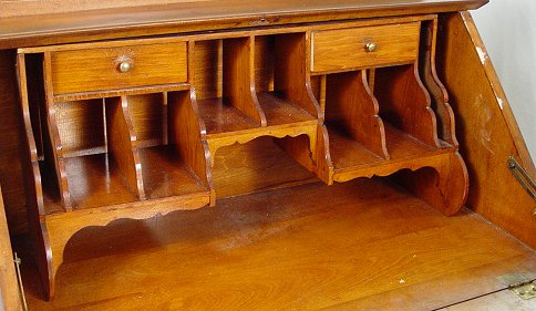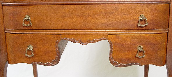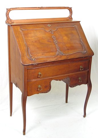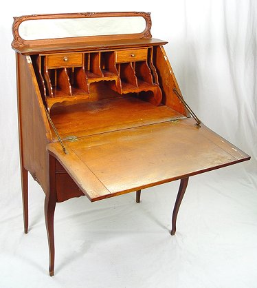 EARLY 20TH C LADY'S DROP FRONT DESK: Featuring applied carvings, beveled mirror backsplash, and interior cubicles and drawers. 46''h. x 31'' x 17''. Lighter mahogany.