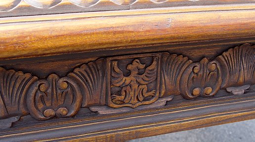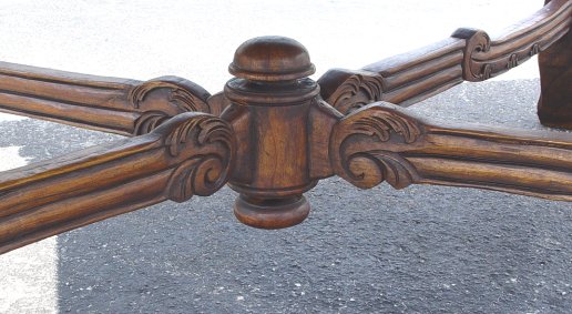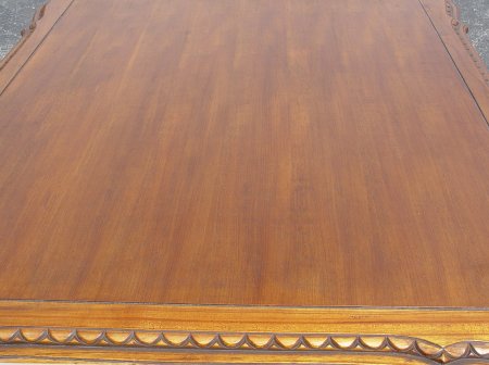 MAGNIFICENT LIONS HEAD CENTER TABLE: Scalloped, carved and tier rimmed ed top over 4 truly wondrous bearded lion carved legs. Cross stretcher. Walnut? 30''h. x 45'' x 58''.