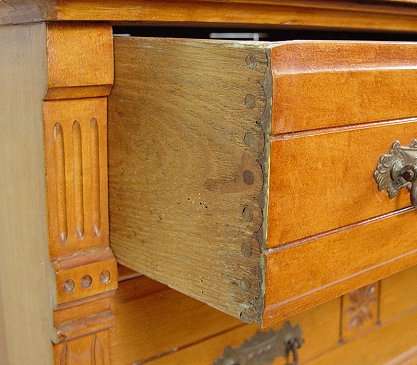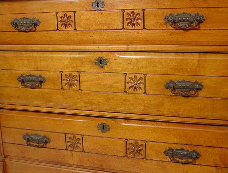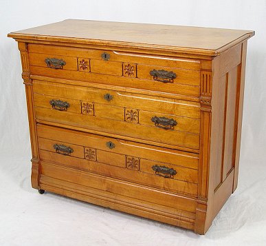 VICTORIAN COTTAGE CHEST: Light Pumpkin ? wood 3 drawer chest with spoon carved flowers to the drawers. Overhanging top, original Victorian hardware. 33 1/2''h, 40''w. x 20 1/2''.
