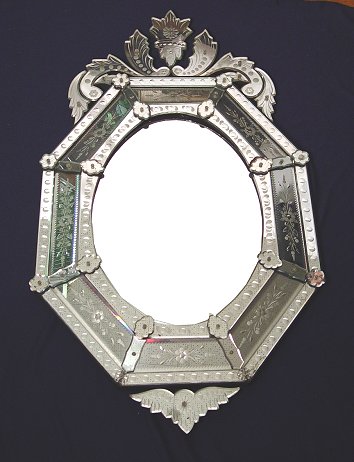 ETCHED VENETIAN GLASS OVAL MIRROR: Oval mirror in octagonal etched glass frame, ornate crest. Mirror may need to be tightened in frame before hanging. 49'' x 28''.