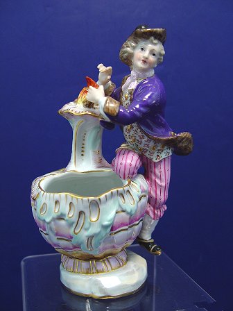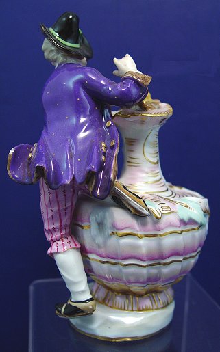 MEISSEN FIGURAL VASE: Ice skater warming his hands at a fire. Note the hand painted detail to costume. Blue cross swords mark. Unfortunate loss of ice skate tip and very corner of his wind blown jacket. 6 1/4''h.