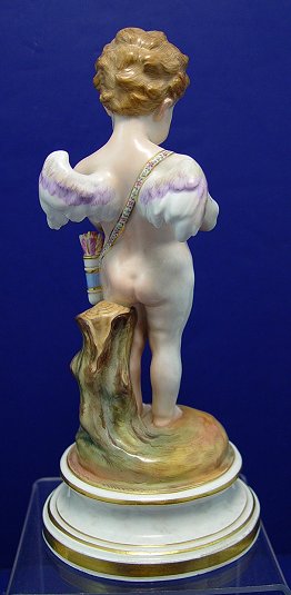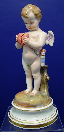MEISSEN CUPID FIGURE: Cherub figure mending a broken heart. 8 1/4''h. Blue underglaze cross swords, incised potters mark L 116, and impressed 66 or 99. Minute chips along gilt rimmed base.