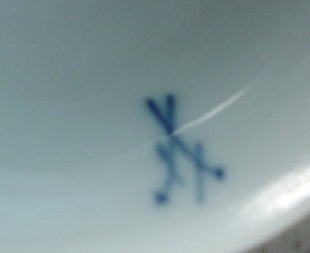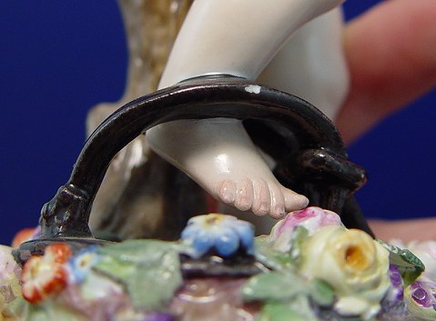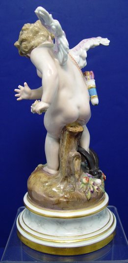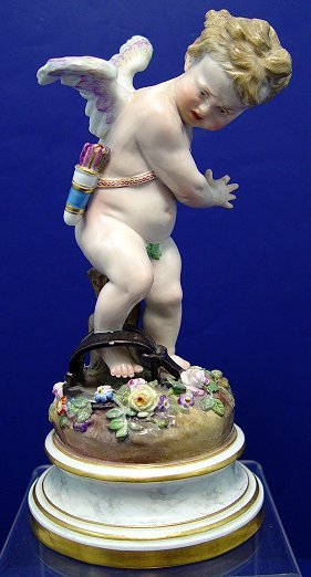 MEISSEN CUPID FIGURE: Winged cherub with roses in his hand and his foot in a trap. Please note loss of finger tip and a very minute (1/16th of an inch) chip on the trap. 7 3/4''h. Blue underglaze cross swords, incised potters mark L**, impressed 66 or 99.