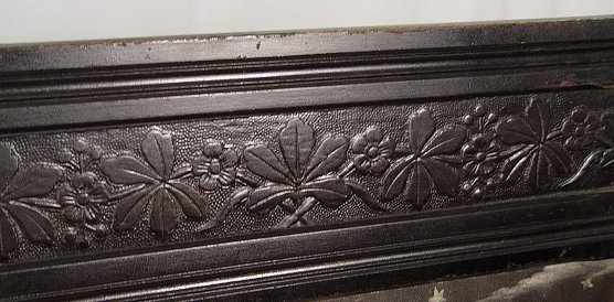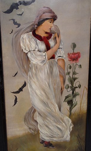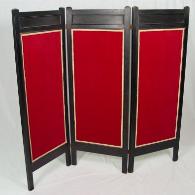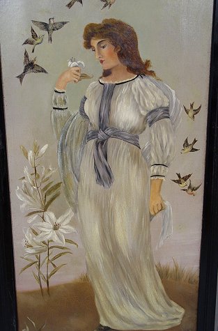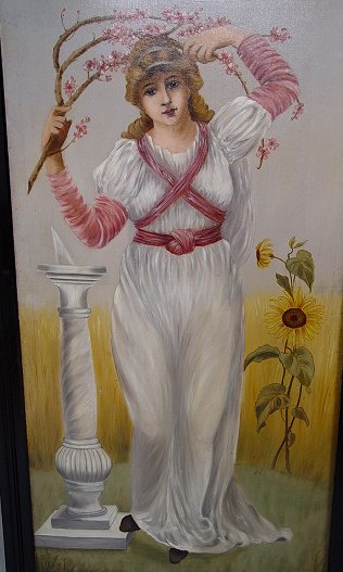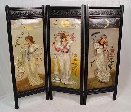 ART NOUVEAU CARVED & PAINTED SCREEN: Ca. 1900 Ebonized carved wood folding screen with original oil paintings depicting young maidens and the times of day, morning, noon and night. 56 1/2''h., 63''w. with each panel being 21''w.