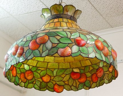 VINTAGE LEADED GLASS HANGING LIGHT: In a ''blown out'' peach, pomegranate, or orange design. 2 sockets, decorative brass cuff. Approx. 25'' dia., 19''h.