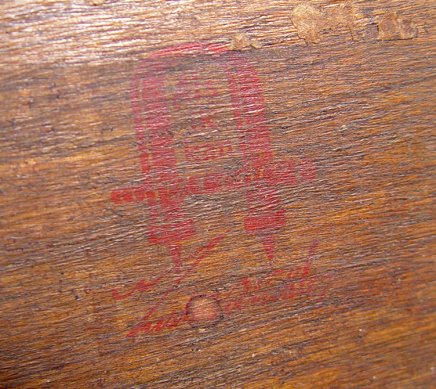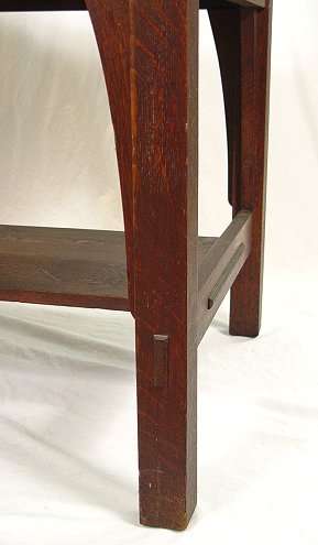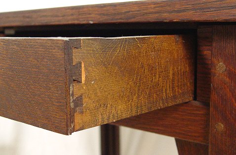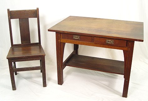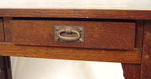 GUSTAV STICKLEY LIBRARY TABLE 614: Fumed oak, two drawers with hand wrought iron pulls above a stretcher shelf, long corbels, 30''h, 42''l, 29 3/4''w. Red ''Als ik kan'' joiners compass mark stamped on interior of drawer.