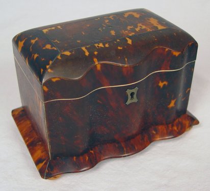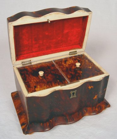 TORTOISE SHELL TEA CADDY: Serpentine front, bun feet. Double well interior with ivory trim and ivory finials on the well covers. Very minor shell loss. 5''h x 7'' x 4 1/2''.