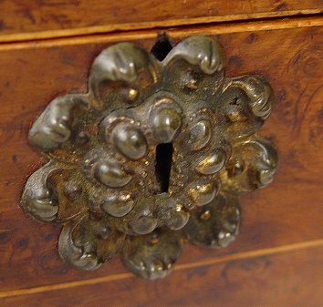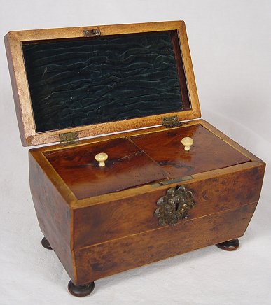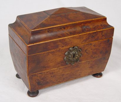 BURLED YEW WOOD ENGLISH TEA CADDY: Sarcophagus in shape with string inlay following all angles. Bun feet. Velvet lining under the upper lid. Double well interior with covers. 7''h, x 8.5'' x 4.75''. Est. $750/1000**