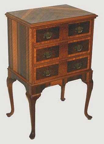 DIMINUTIVE QUEEN ANNE STYLE CHEST: 3 drawer stand raised on Queen Anne legs. Handsome mixed veneers of striped and burled woods. 34''h, x 22'' x 15 1/8''.
