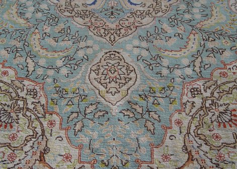TURKISH HAND TIED SILK RUG: Approx. 4'2'' x 2'9'' excluding fringe. Pinks and turquoise. Purchased by the consignor in Turkey for $1500.
