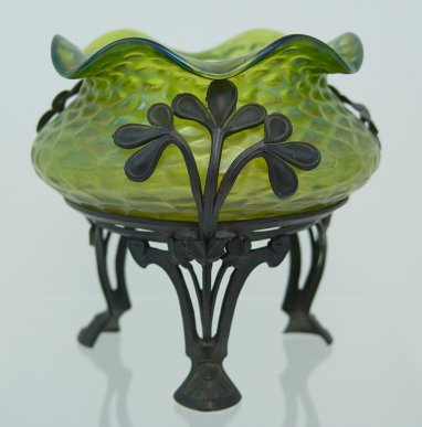 ART NOUVEAU BRONZE MOUNTED LOETZ OR KRALIK ART GLASS: Green iridized glass, turned and ruffle rim in the texture Kralik is known for. Raised on hoof feet and encased in naturalistic leaves. 4 3/4''h., 5'' dia. overall.