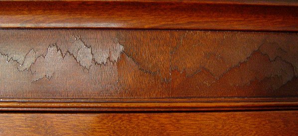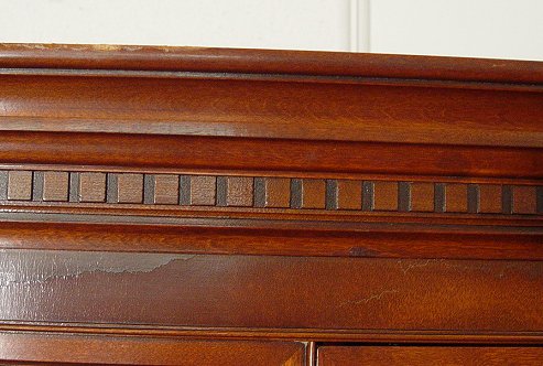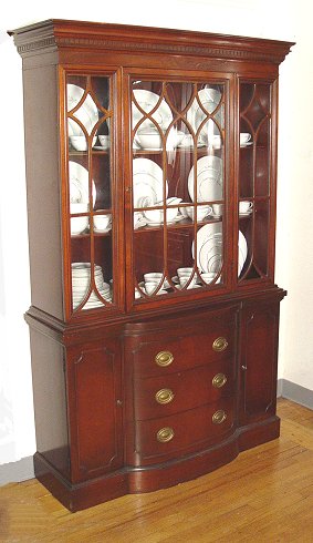 MAHOGANY BREAKFRONT CHINA CABINET: Upper section with straight cornice, dentil molding. Lower section has bowed center of drawers. 71 1/2'' x 44''w.