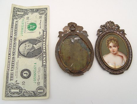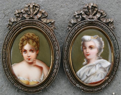 PAIR OF MINIATURE PAINTINGS ON PORCELAIN: Early 20th century oval, 2'' x 1 1/2'', no visible signature, encased in worn, leaded frames.