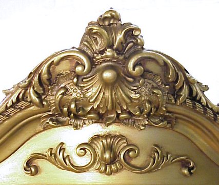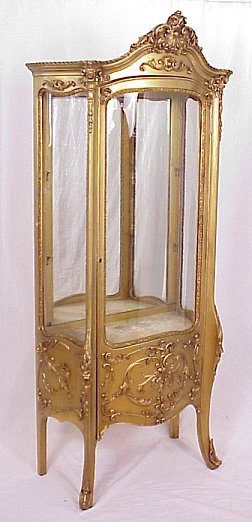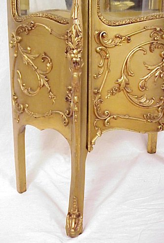 FRENCH GOLD WASH VITRINE: Bowed front curio cabinet with carved crest. 2 Serpentine glass shelves, cloth covered shelf, covered storage on the bottom. 70''h. x 29'' x 17''.