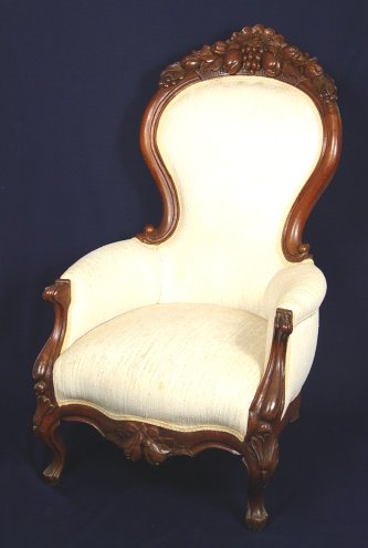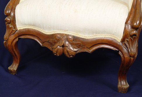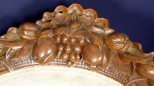 VICTORIAN FRUIT CRESTED CARVED PARLOR CHAIR: The deepest fruit carving we have seen on a walnut framed chair, carved bottom rail and legs. Upholstered arms. 43 3/4''h., 27''w.