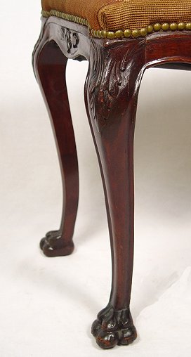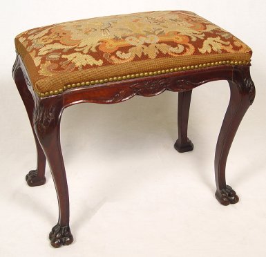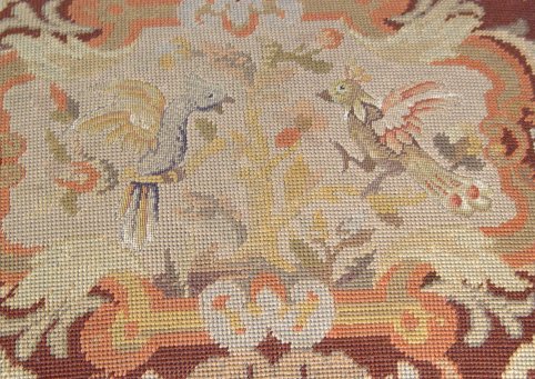 CARVED MAHOGANY NEEDLEPOINT BENCH: Charming bird motif hand worked in petit and needlepoint. French style carved mahogany frame with claw feet. Great patina and just the right amount of wear for earlier 20th C. Approx. 18''h, x 22'' x 15''.