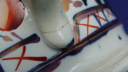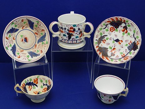 GAUDY WELSH IRONSTONE GROUP: Three piece to include a three handle loving cup, 3 3/2''h. Two handless cups and saucers. All in different patterns with rich cobalt and luster. Crack starting to form in one saucer.