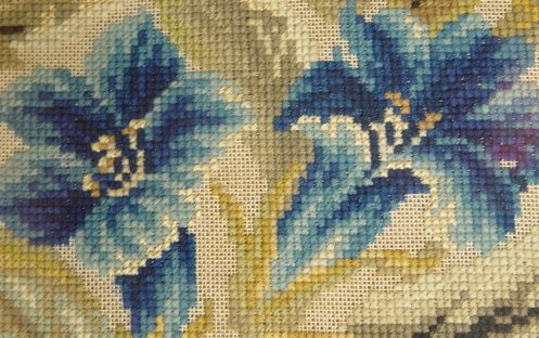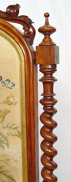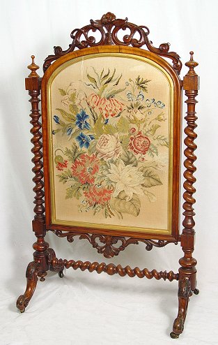 STUNNING FLORAL NEEDLEPOINT FIRESCREEN: Behind glass in a beautifully carved Jacobean frame on splay legs with wheels. 53 1/2''h. x 32 1/2''w. x 21 1/4''d. Est. $1200/1600**