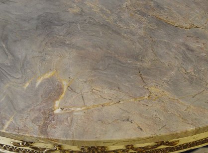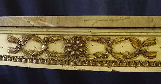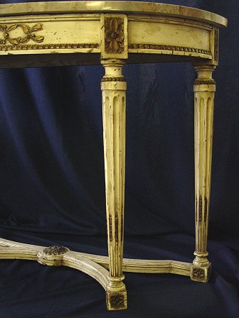 FRENCH LOUIS XVI MARBLE TOP CONSOLE TABLE: Demi shaped marble rests on Louis XVI style base. Original painted finish, curved stretcher between reeded legs, applied gilt carvings. 27 1/2''h, x 37''w. x 15 1/2''